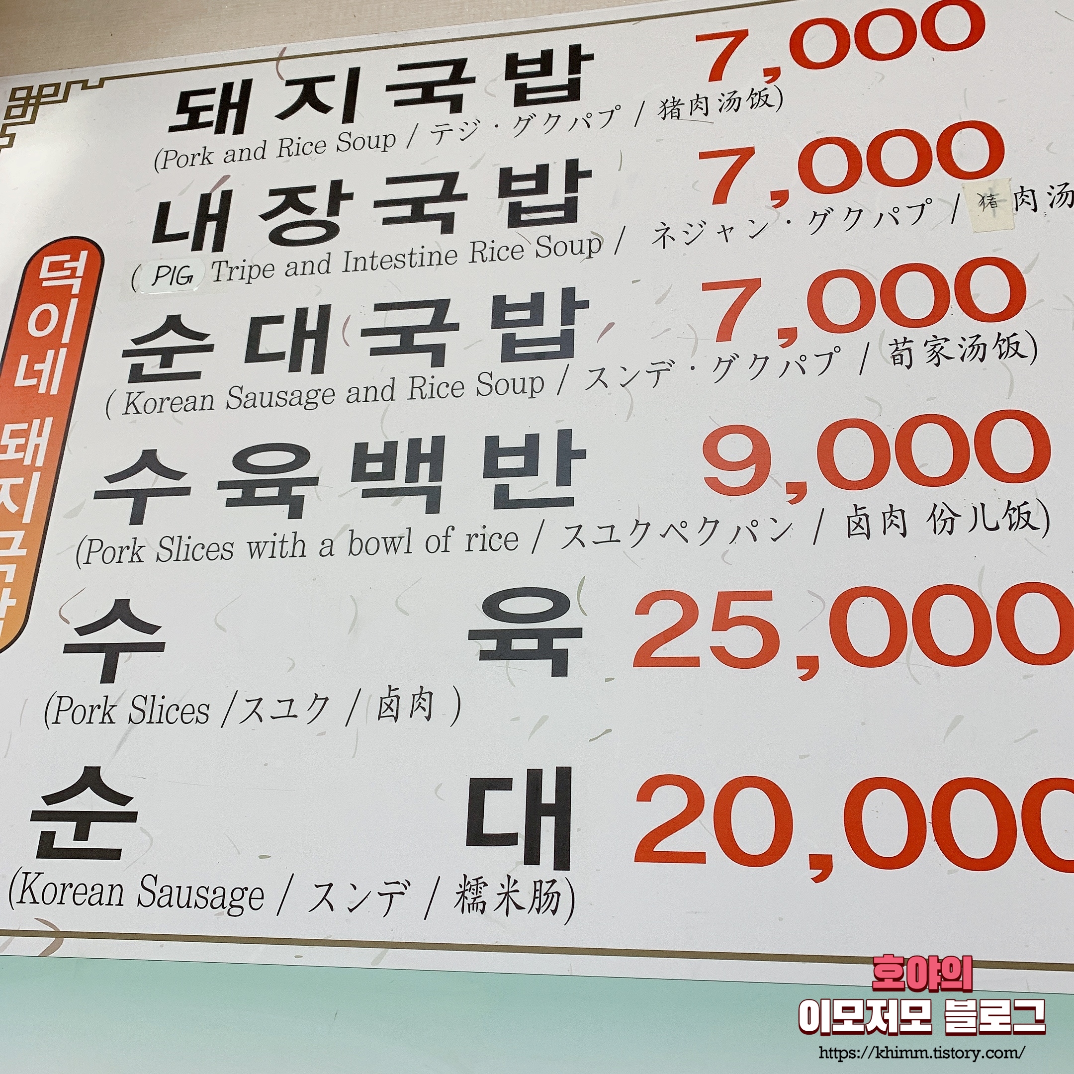 덕이네 돼지국밥 집의 메뉴판입니다.